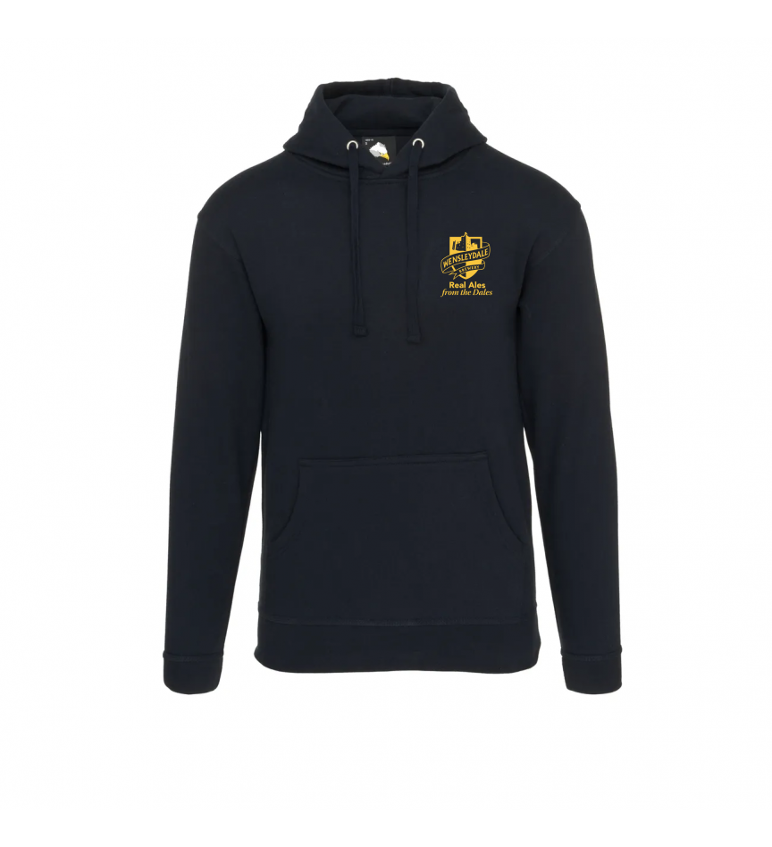 Navy Wensleydale Brewery Hoodie with printed logo.